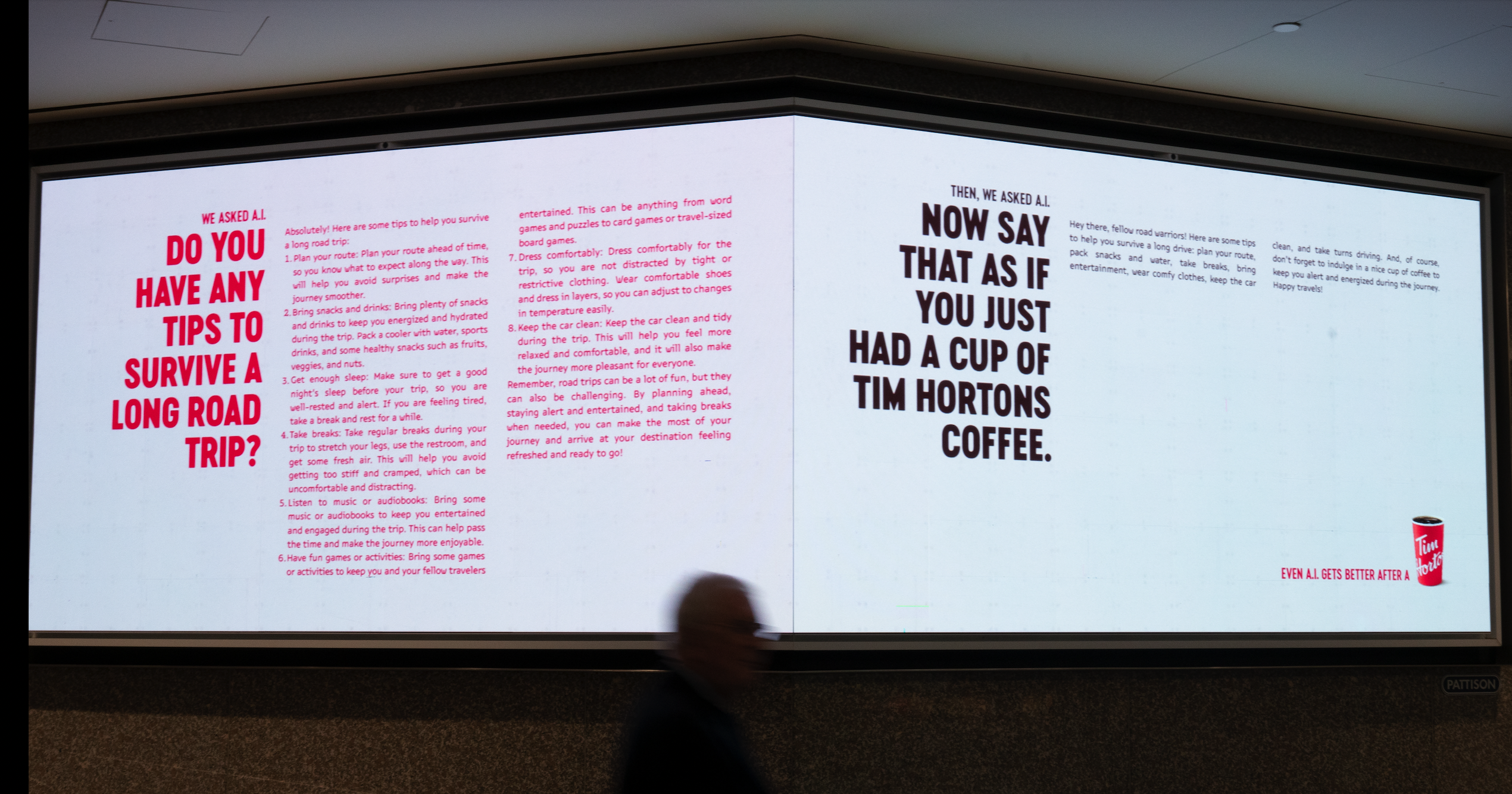 While the first answers were predictably articulate, they were also quite long. After the AI had had its cup of coffee, the answers had a friendlier tone, and were significantly more concise. The ads show the questions and answers side by side, with the payoff line, "Even A.I. gets better after a..." beside a Tim Hortons cup.