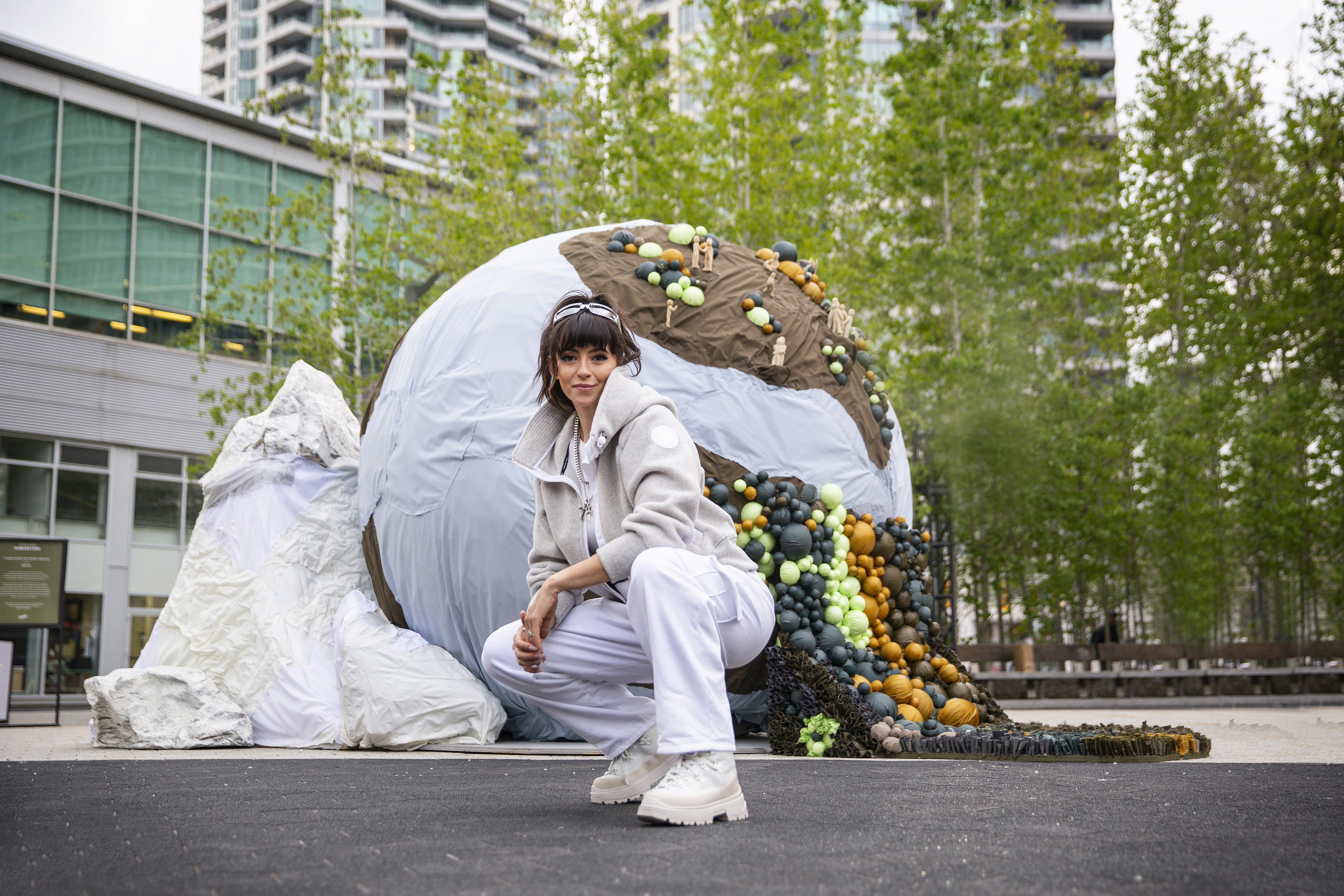 The eight-foot tall installation, "Reborn," uses materials from Canada Goose stores, as well as items taken in through its warranty program.