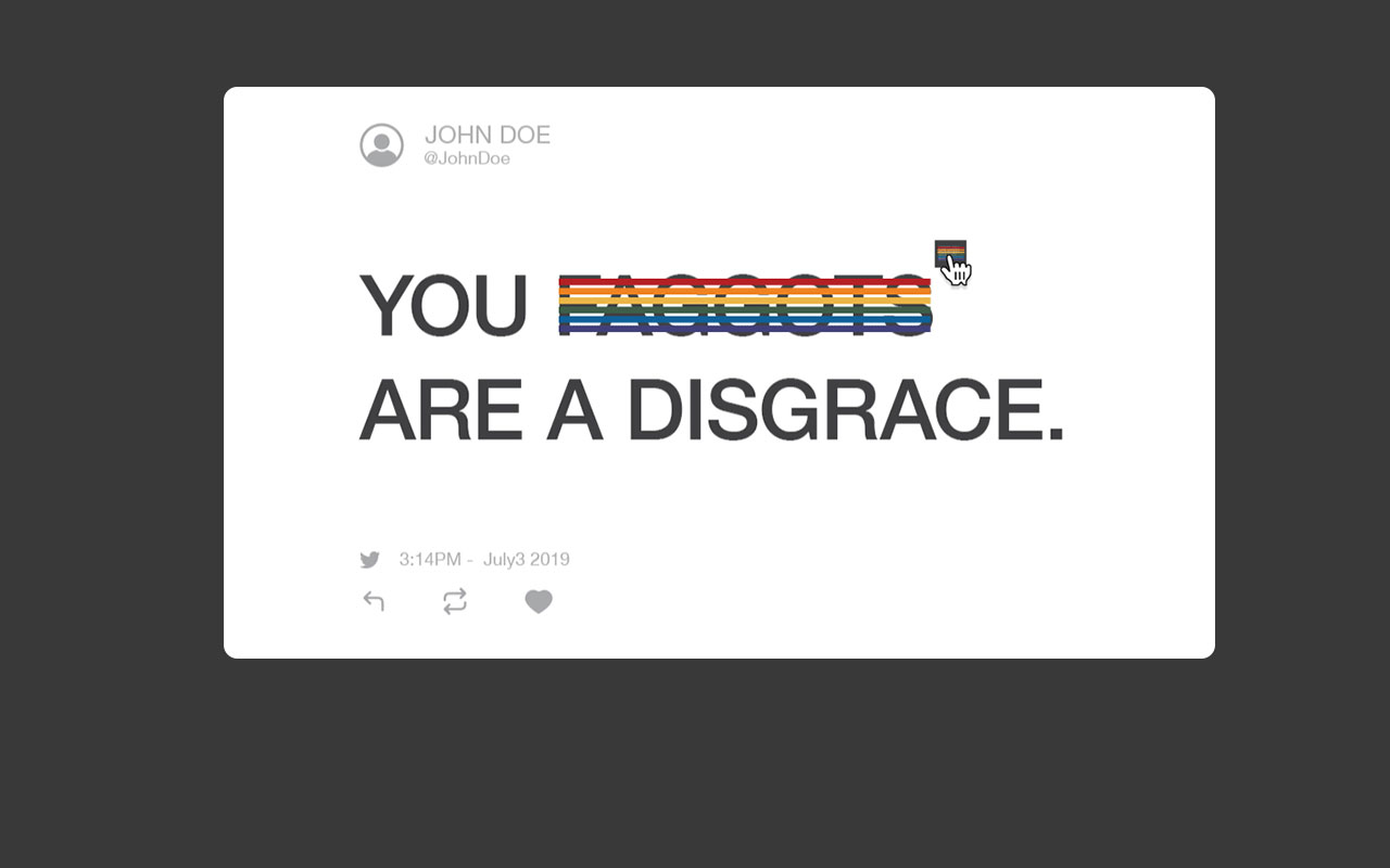Pride Flagging identifies 50 discriminatory words in 10 languages and obscures them with the Rainbow Flag.