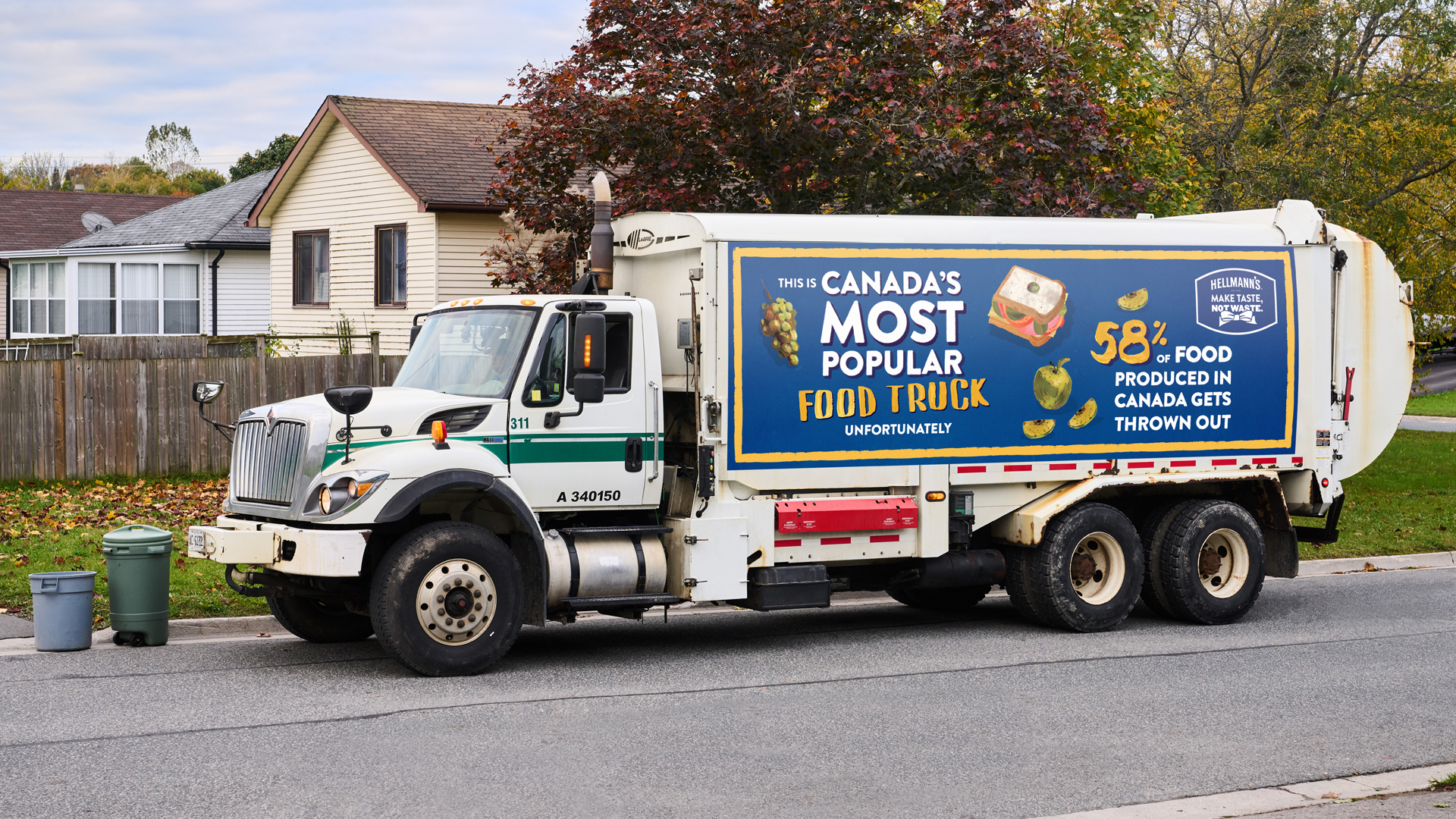 How: For the next three months, five of Peterborough's fleet of garbage trucks will feature Hellmann's branding, accompanied by the message "This is Canada’s most popular food truck. Unfortunately. 58% of food produced in Canada gets thrown out." The idea came from Hellmann's brand manager Ben Graham, who was looking out of his window during garbage pick-up day and started thinking about the practicality of using garbage trucks to deliver a message about food waste.