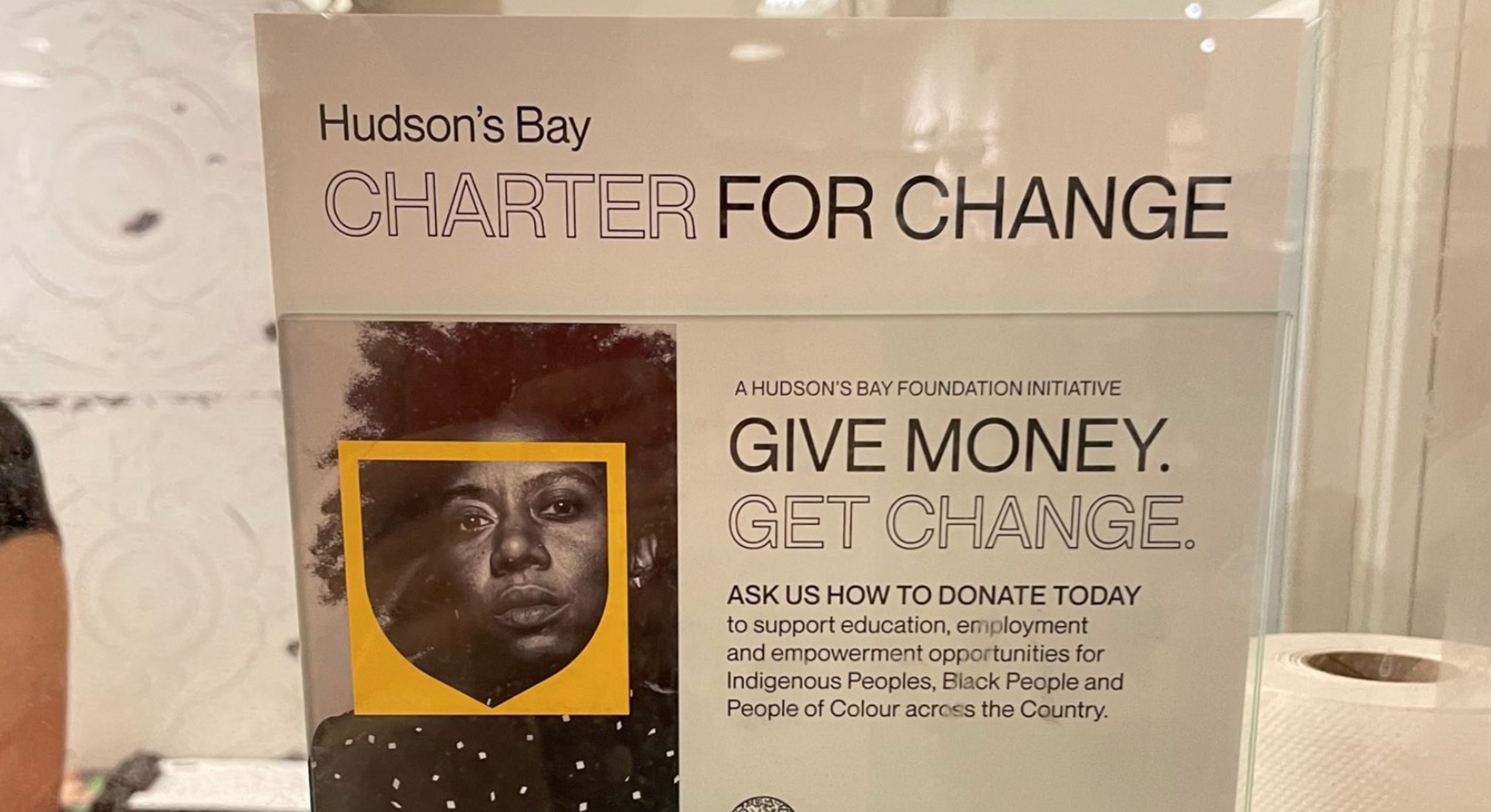 The display featured Roderique's image next to text identifying Charter for Change as a Hudson's Bay Foundation initiative. The accompanying text read "Give money. Get change," and invited customers to ask how they could donate "to support education, employment and empowerment opportunities for Indigenous Peoples, Black People and People of Colour across the Country."