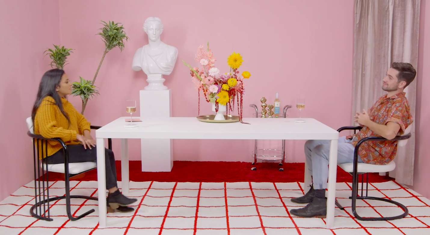 Persis—who is looking for love in a pandemic—sits at the end of a long table with a glass of Naked Grape in front of her. Three prospective love interests enter, one at a time (two men and one woman) and sit at the other end of the table—a good six feet away. Persis asks them a series of questions, including a “Naked Truth” question, before choosing who to go on a real date with.