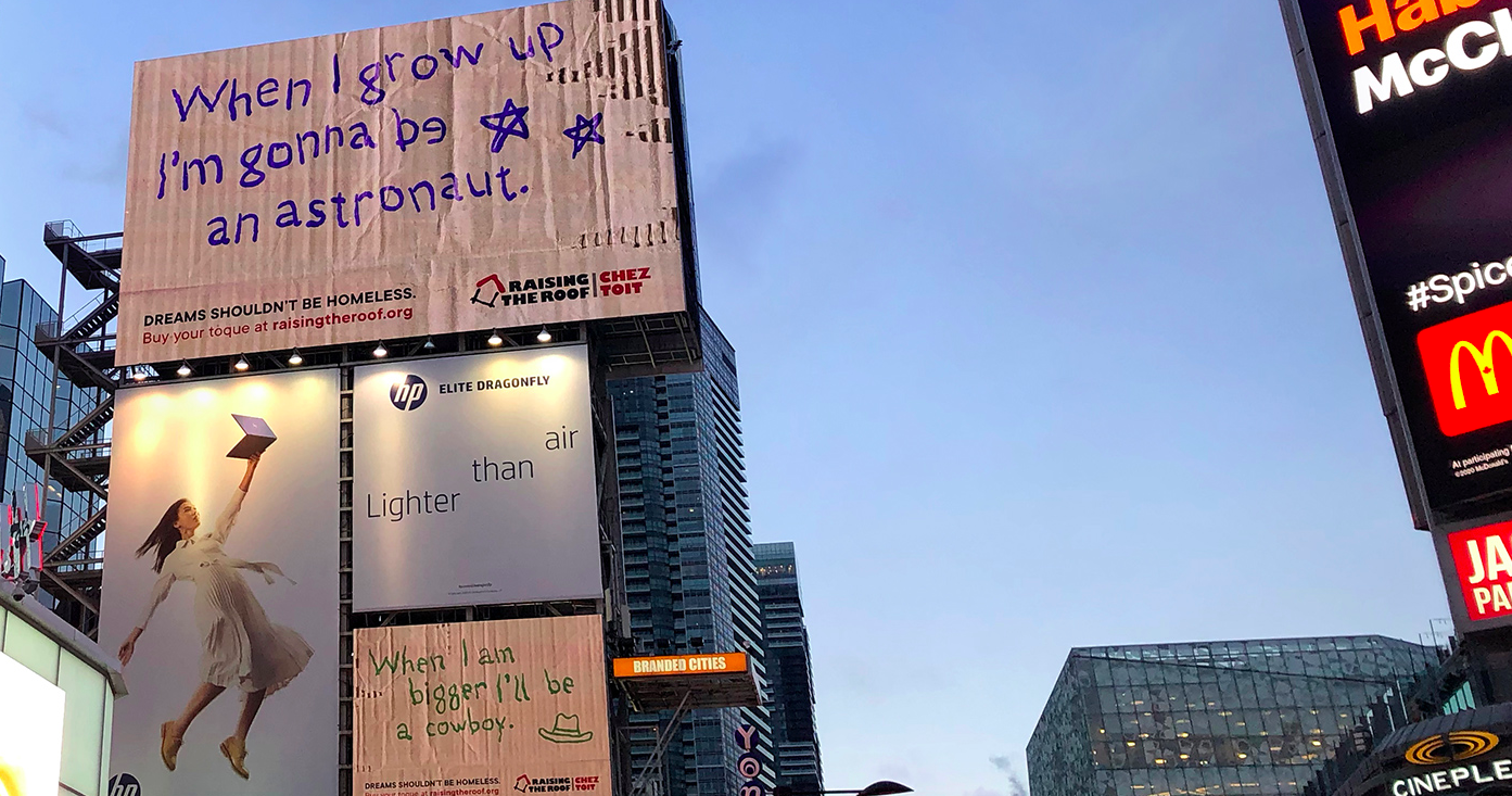 Digital cardboard: In Dundas Square, the public gathering place in the heart of downtown Toronto surrounded by massive high resolution digital billboards, two of the most prominent digital screens were made to look like a massive cardboard sign with the message "When I grow up I’m gonna be an astronaut" and "When I am bigger I'll be a cowboy."