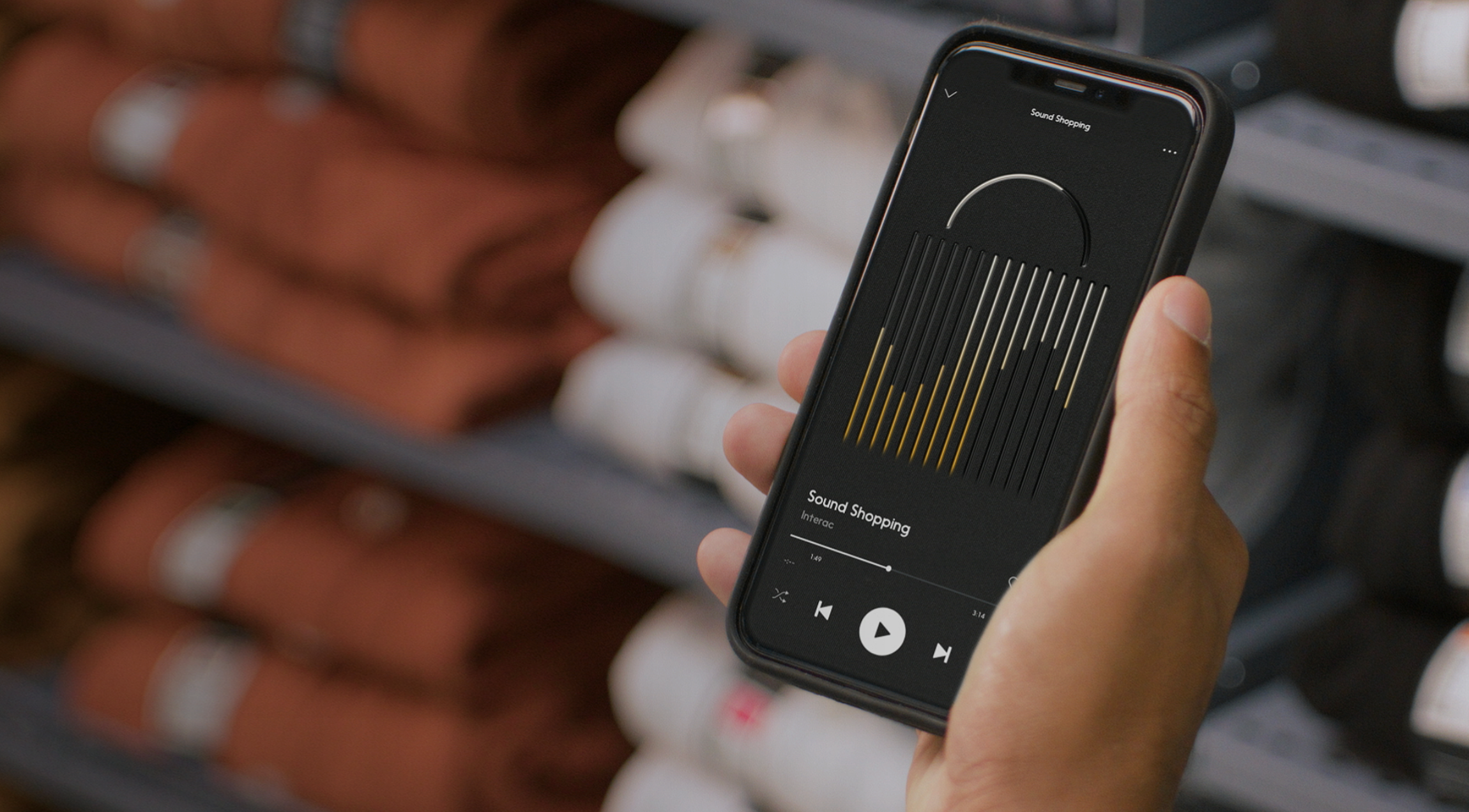 In terms of visual assets, the campaign uses Interac's brand colours in a graphic treatment that turns sound waves into the form of a pulsing shopping bag. “The creative design articulates the notion of music meeting spending behaviours in a clear yet impactful way," said executive creative director Wain Choi. "Most people are familiar with the idea of music encouraging shopping in store, as a brand that stands for control, our goal was to encourage mindfulness instead."