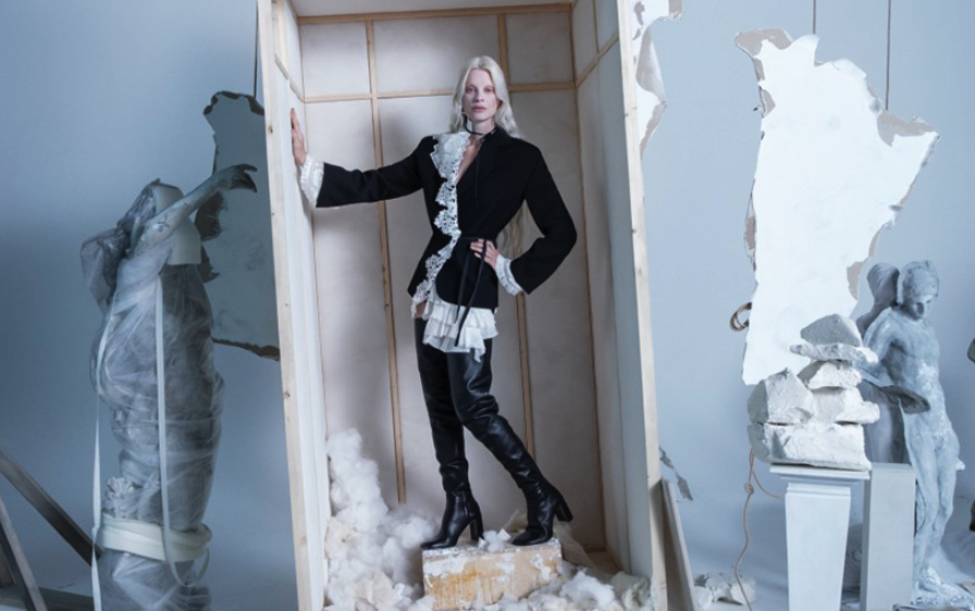 The images, for 'The Jacket' campaign for Zara's Atelier series, featured a model surrounded by rubble and statues with missing limbs. One image showed a model carrying a mannequin wrapped in a white sheet.